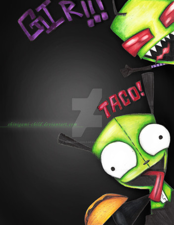 I was haveing a shower when it dawned on me, Zim and Kim are only one letter apart! I'M VERY SLOW! xD!!!So I drew Invader Zim and GIR as Kim and Ron. GIR is a Naco-Man! (if you don't know a Naco is a taco crossed with a nacho)