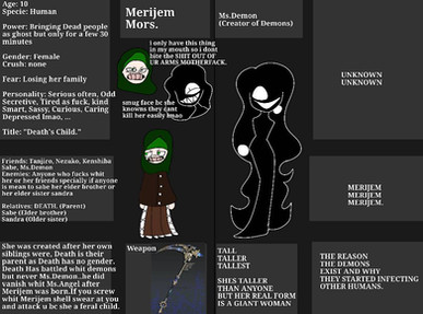 Mayen is a spirit who lived a peaceful life in the afterlife realms but later on decided to visit the world's of humans and monsters. She decided to run a church that welcomed all religions and used it to help people follow the righteous path based on the religion they support and help them figure out their religion or if they have one. Mayen also helps protect all mortal beings from any harm and also helps the immortals do their jobs as well.