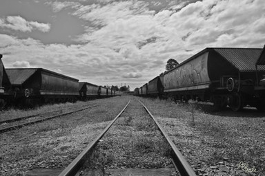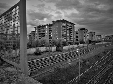 Rails in the middle of the road that runs alongside the factories. Testimony of an industrial past, this railway line connected the factories to the national network. In the 90s it was still visible.Original image on Ilford Delta 400 film.