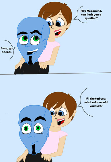 The joke was taken from Jeff Dunham's 'Spark of Insanity' standup, where he says he gets over arguments by thinking about different things, such as 'If you choke a smurf, what color will it turn?' I figured it would be the same principle with Megamind