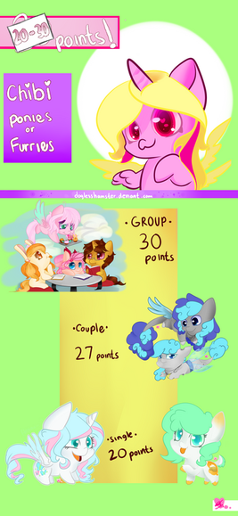 well it says in the commissions a full body pony chibi is 5 points and a half body pony chibi is 3 points and if you asking for a human chibi, then those commissions arent out yet, meaning im not doing human chibi commissons but i will in the futureΒ