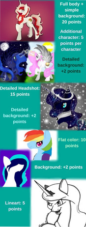 oh sorry....and you could get a sketch which is 2 points each or you could get a half body noraml for 5 points or you could get a full body chibi for 5 points or a half body chibi for 3 points ^_^