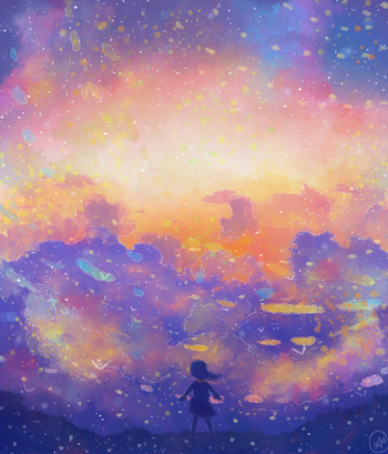 The scene itself is amazing and makes me feel right at home; the vision is just perfect (though I think her legs are a little off. That might just be me). The colors just make everything calming and...pastel? As for originality, this piece on its own would be 5 stars, but some of your other drawings also have the same overall feel to it, so half a star off but this is still amazing. I've never (personally) tried drawing like this so technique is not my strong suit, but the coloring is great and the galaxy patterning is topnotch. For impact, a little less focus on the girl would wrap everything up nicely. To me, it seemed like the shooting star was lighting up her mini-world so a bit less lighting on the swing-set would've been great (this is my opinion)