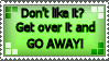 Okay, so, here's ANOTHER rant. I figured it would be just plain lazy not to add any 'art' to it, if that's what you call a stamp I made in 5 minutes with 's stamp maker, which can be found here [link] .I can totally understand why you wouldn't like a certain cartoon/anime, manga, artist, etc. I can understand you have so much hate for something that you feel the need to use precious computer storage to draw a picture to express you rage with it. What I can't understand is why people are so lazy when it comes to hate art.