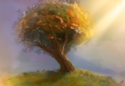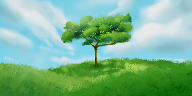 That is an awesome tree. Love the kind of slapdash impressionistic feel of the foliage and the grass. Gives it a good sense of movement I think. That quick brush stroke hill in the back there looks windswept! Love the detail in the bark and those are some very nice clouds.