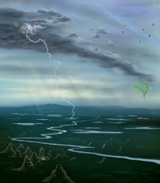 A pair of kuokios is slowly sailing down the one of countless branches of the great River, illuminating its banks with their flamboyant bioluminescent marks. Despite their impressive size, mighty ship-beasts look almost harmless as they drift motionless, only slightly waving their flippers... if we forget about long venomous tentacles swaying beneath.____