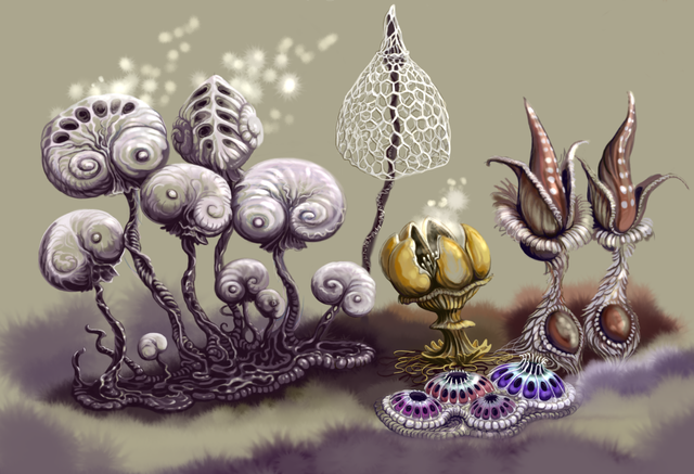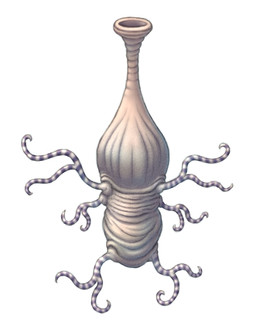 Pectukoida are a subtype of skeletal animals, close relative of ambarrian vertebrates. These weird creatures begin their lives as vertebrate-like larvae, but instead of metamorphosing into advanced hexapods they turn into primitive sedentary beings. Their degraded bodies are mostly gelatinous, with simplified anatomy, and usually with long elastic tentacles. Jadongs know a dozen of pektukoid species, but classify them in just three groups.Left - pectukoi, the least specialized and the most widespread and diverse among these creatures. They have a long stalk that ends with multiple suckers. All six pectukoi's fins look like tiny scales and are very hard to recognize even for the best scientists. Many of their species have feather-like filter tentacles, other are hunters.