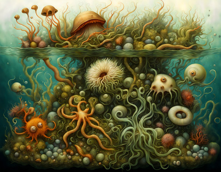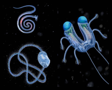 Bottom right - querenge, the most anatomically simplified group of pectukoids that attach to bigger aquatic animals, burrow under skin and accrete with victim's blood vessels. Their main bodies have only a few eyes, simple brain and a gland that produces signal substance to warn their host when the creature notices any danger. They don't have any heart, gills etc.
