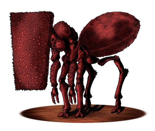 This animal dwelling in distant mountains and plateaus is so bizarre that it`s often mistaken for some sort of relict robot left by Masters (it`s not, but those are definitely a thing). Its leg armor just naturally looks like some mechanical parts - it allows the animal to fixate its legs in a given position. It`s also very hard and sharp. The tiny scales refract the light in a way that makes them look like blue or green glass with a pink tint. The upper side of a massive star-shaped carapace imitates a nondescript patch of dirt and rocks, while its lower side is one giant radar organ. This giant star is supported by extensions of ribs and vertebrae that form a basket similar to a galerid skeleton. Five large spiracles are located on the sides.