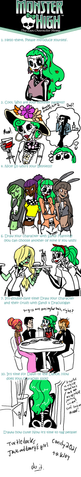 Her mother had a brief affair with Mr. Grim, and after finding out she was pregnant, he high-tailed it. Santana grew up in a trailer park, completely content playing with the other kids and little monsters who lived there, she never knew that there was anything considered better. Soon she graduated junior high and came to Monster High, where she realized that other monsters would look down on her. Now she keeps her home life to herself almost completely.