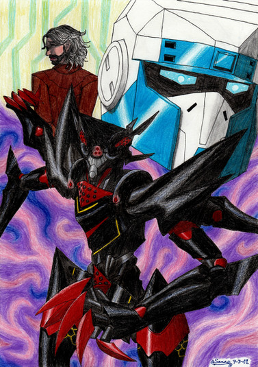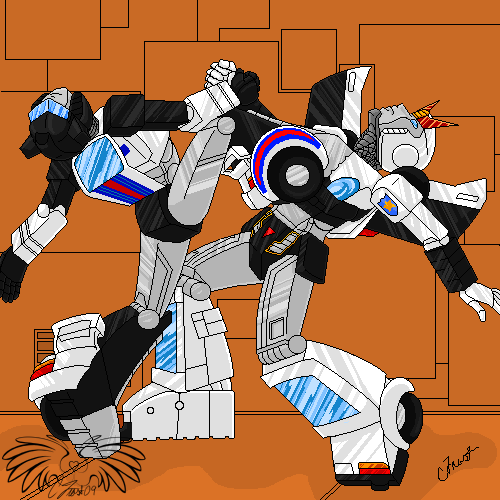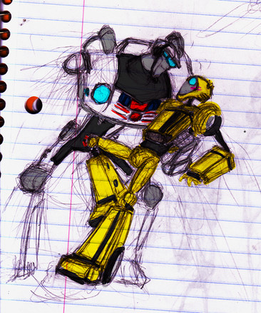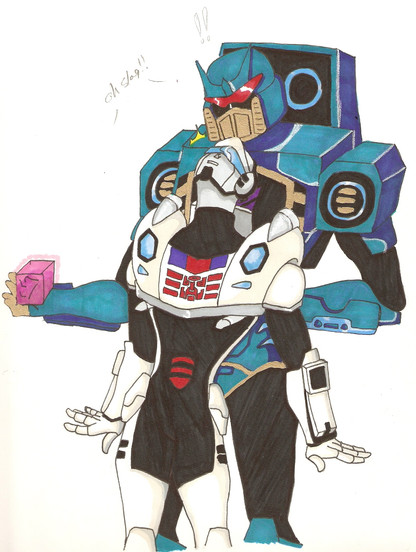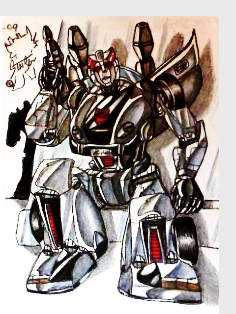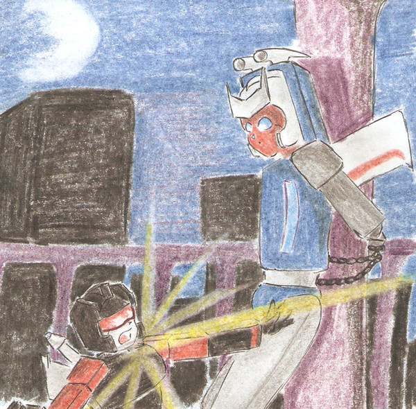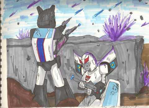 There was an electricity outage in my village today and it lasted half the day. I was bored out of my mind and angry, which somehow produced this pic. The colors are to say at least interesting since there was only the natural light to work with and of course my desk happens to be in the most darkest corner of the room. Also, of course I didn't have access to my computer, so I could have looked up some reference.I used my Bluestreak toy's gun as a reference for Prowl's gun, because my Prowl doesn't have a gun(picked him from flee market). It's not even close to what it's supposed to be, but please don't kill me for it. I did colour everything at least thrice, which maybe makes up for it.