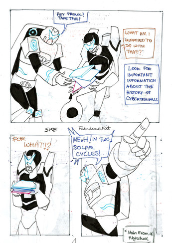 I wanted to try something new and here's the result. All the artwork is done in traditional way and then I just put the results sloppily together with SAI. My hand is aching now and it's not from jacking off, but from the colouring. Wooden colours are not the easiest way to do things.Prowl has worked late again and wants to have some nice recharge, but is surprised by Jazz. What happens next is up to your imagination.