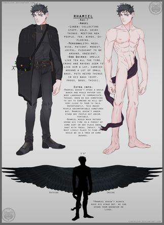 Timothy had never experience childhood(Nor did he know what it was to be a child as a whole), no the man was made and that was all. He had no parents for he was created and was instantly drawn into a mind set of obedience. Yet he had will power against his master and those around him who were either a higher rank and or a lower rank although his desire was to be loved by his master and to show he was capable of doing his bidding. To protect him as well as to praise him and or admire his creations that came after his own. There were plenty of things he had wanted though, one of those desires was to be the most loyal and as well as the most known. He wanted to gain ranks, and pushed himself to be the angel of his king's eye. Watching over those he was mean to guard; to protect them from wicked thoughts and temptation by fighting against demonic entities. Which he was rather good at this task, and when a pocket of angels had decided themselves capable of taking over his king's throne Timothy was against them in that battle as well. He had made an enemy in this civil war between angels. Yet, his own half was of course victories and Tim for the first time seemed fearful. Watching each angel become banished out of heaven and their wings become dark and tattered, some even growing hideous upon their face and skin, the one he had injured to never fly again and see was one of the last few to fall and The vial curses he spoke upon Timothy even cause a chill to befall upon him enough that his own body jerked back and he no longer watched.