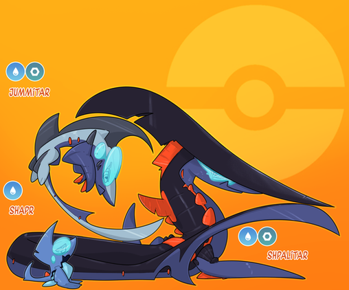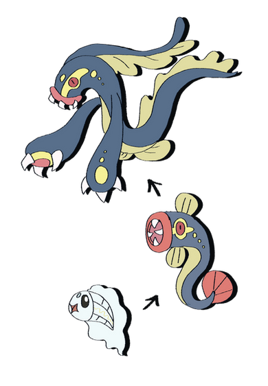 I love this! I really like your style, and I was just having a conversation the other day about how water starters are normally in some way amphibious, and that I'd really like to see a completely sea/deep sea starter some day. Really great concept!