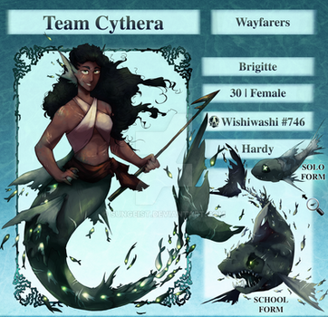 "Enigmish swim through the abyss at breakneck speeds, their antenna and large fang-like structures under their chin sense their surroundings in the darkness. As quickly as it strikes, this Pokemon disappears into the darkness again."