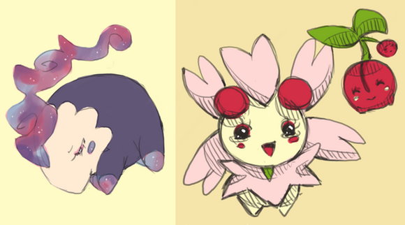 The ones that came to mind first were... Bounsweet is some kind of fruit (I think), Swirlix is cotton candy, Vanillite is ice cream, exeggcute is EGG, and cherrim is a cherry !
