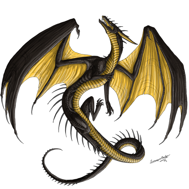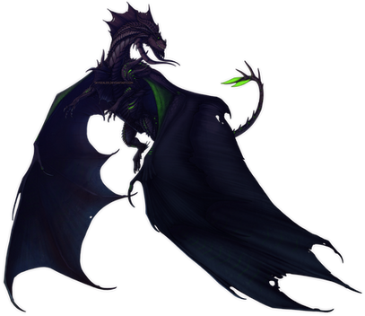 I especially enjoy drakes of this sort, dark and spiny. He sort of reminds me of Nalice, one of your earlier works you did, with his coloration, spines and scale. Despite his mouth being the only element of color, it isnβt distracting from those magnificent wings.