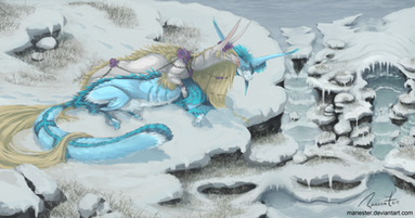 Please correct me if I'm way off, but did you put some easter eggs in this painting? Maybe it's my mind playing tricks on me. I found at least two dragons "hidden" in this picture. One right behind and aligned with the lighter dragon. It is delineated on top-left by the stream, with the lower part of its head underwater. The other one is to the left of the first trace of the stream. It is white (the snow on the side of the mountain). It looks like a Japanese-style dragon in flight.