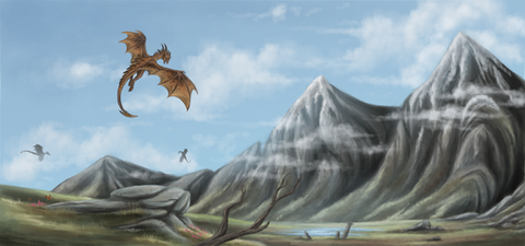 Aaaah man I just freakin' LOVE your landscapes! You really have an awesome way of making them look sort of unrefined and yet SUPER detailed and I really freakin' dig that. LOVE the colors too. Like those ruddy yellowy greens. It reminds me of lakes in the fall or something. The water in particular is AWESOME! I love its color and the reflections bouncing around in it! And of course the dragons are totally boss as well. I love how detailed they are and I love the shape of the wings on that guy in the back! AWESOME freakin' job! <33333