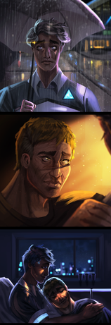 part 2 of HankCon Archive xover (double human AU) from selrahcngow and me, Hank trying to put dead Connor's remaining consciousness into an android body. Thank you for making my little headcanon come true💙