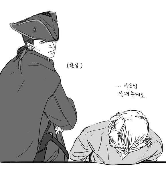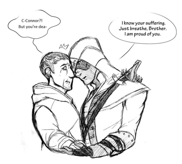Connor and his father Haytham Kenway with Shay Patrick Cormac.Connor played a trick on their ponytails XD