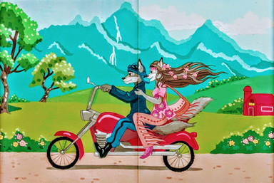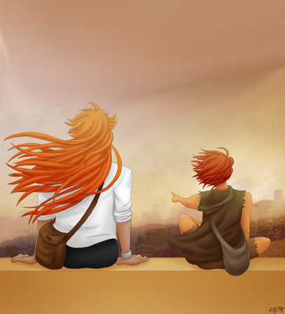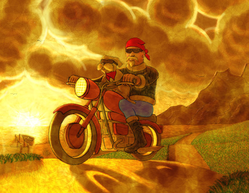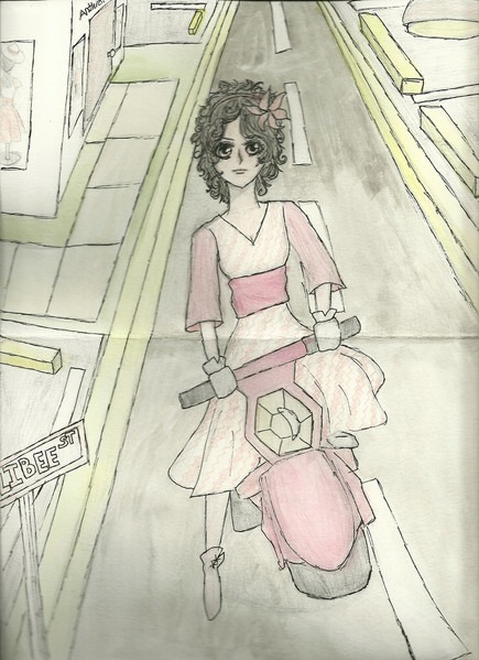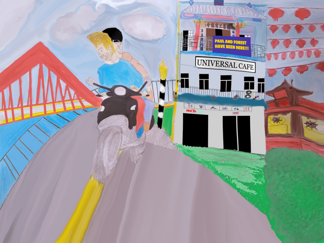 Your paiting is so pleasing to look at. The motorcycle poiting down the corner gives the sens of motion. Especially because main line of your composition is oblique while rest are horiziontal and vertical. I also like Kiro's happy face. It must be awesome to ride like this