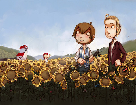 Oh my God, I love that wish. There's nothing quite like riding down the road on a motorcycle! You did very well on Kiro, his motorcycle, and Kari! I love how she's in this and that he wants nothing more than a hot babe to accompany him. xD Excellent work done on the perspective and attention to detail as well! The rows of flowers and mountains really add to the scenery.
