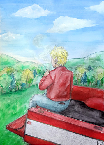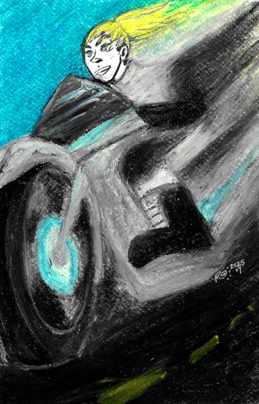 Oh wow! I love this piece! I really love the atmosphere and composition here! This is such an awesome wish for Kiro! You did such an awesome job here with the acrylics, and that motorcycle! The hills in the far background are so beautiful, Wow! I love Kiro's expression and sunglasses and Kari on the back there! Fantastic work, love it!