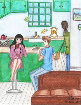 You did quite well on the architecture, to be honest! The perspective is pretty neat, and you decorated well, using the space on your page well (aka: it's a good composition!) Their sparse belongings reveal that they've got a humble abode (while still having a homely living space!), and this piece shows that very well!