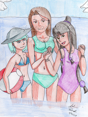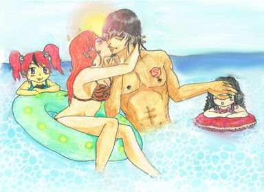Great work on the details in this piece, and the water as well. I like how Shiden is just staring at the two girls, not sure what to make of them. I like how Fiala is obviously blushing while looking at him and stalking him lol, and he just feels so awkward and probably knows about her obsession already.