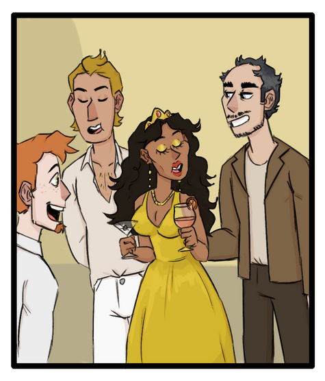 right foreground/middle - Dr. Kai and the Stallion at her side, Aardrin Randbourne (her prom date <3), enjoy the company of Falco and Rosline. Her comment grosses out Hunter and encourages Kyouka & Cello.