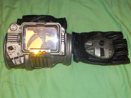 Remember kids, when traversing the wasteland, or scav'ing the DC ruins, don't forget to bring along all the necessities... or lacking those, at least one weapon [with as much ammunition as you can cram in your bag] and your trusty RobCO Pip-boy 3000 (Now with Handy Dandy Hand-plate!).Made for a customer, finally had someone want a hand-plate to go along with a pipboy, so I was most happy to oblige. If you or some wastelander you know wants one of your own, either send me a note here or contact me via email; sunsetsworkshop@gmail.com