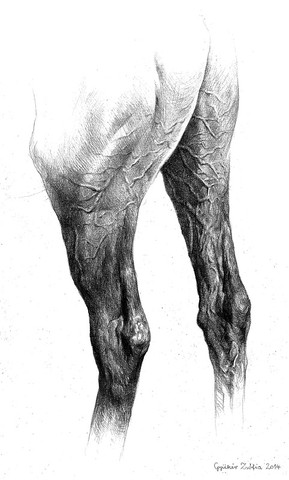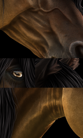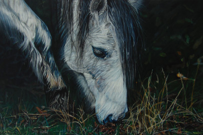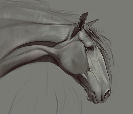 So I thought I would post a closeup so people could see how I work. Hopefully in fullview you can see all the squigglies and brushlines. Usually in horses the fine hair detail is lined in the direction of the hair - in this one this guy I think was faily short coated and with the sheen and sweat I thought round squgglies would give a better texture to the finish.First I draw out the basic shapes - heavily referenced, and maybe shift a few things to balance out the picture a bit.