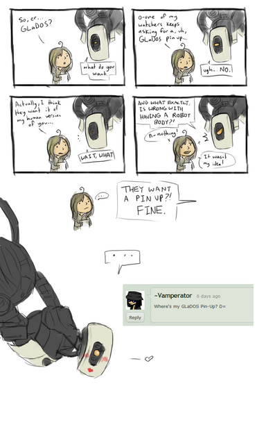 i know nothing about GLaDOS except for when your sister let me play that game but YAY GLaDOS!