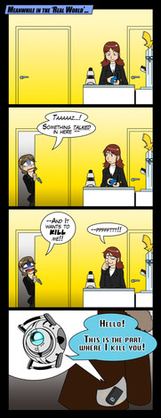 I think comitting suicide with a turret is probably a new level of desperation, does anyone have turret? Lol, jk. That comic is still a win, btw can I have some coffee, GLaDOS? Plz?