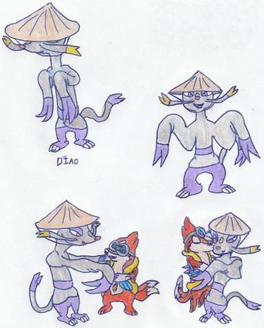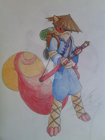 Chugami, distinct among my work, does not have a Sonic-style design, adopting a more semi-realistic look. He is about half SC's height, not counting his pack. Chugami is a wandering storyteller who seeks to gather all the stories of the world. Basically a bard in Chinese garb. Normally, he is very polite and respectful and enjoys the opportunities to tell people one of the stories he has found. However, while he's storytelling, he gets himself drunk on the sake from the barrels strapped to the side of his pack (there's another one on the opposite side), resulting in the story differing widely from its original version with stuff like ridiculous anachronisms, not to mention using much vulgar language. Almost a complete turnaround from his normal personality, huh?