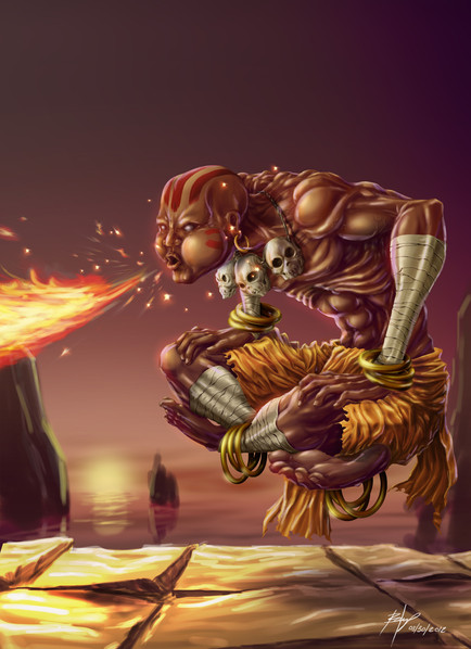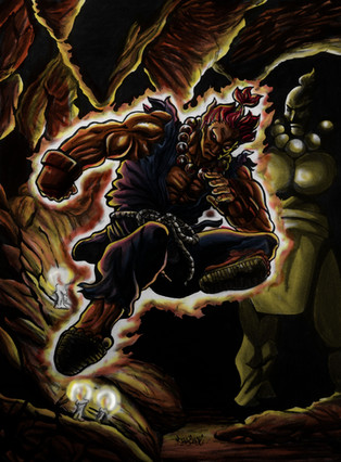 A picture of Akuma from Street Fighter about to Destroy Goukentou (a island from sf alpha 2)Related content