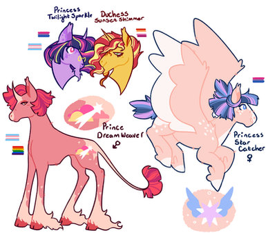 Rarity is the oldest of the Belle family, and always knew she was meant for great things. After being swept up in a whirlwind romance with Canterlot elite Fancy Pants, she and him had a single daughter, Filigree Ajour. However... Fancy Pants's affections clearly lied elsewhere, and the love Rarity had for him faded from romantic. The two broke it off after three years, fairly amicably, but Rarity was still lost with her place in the world. Returning to Ponyville, she stayed with her old friend Applejack, and the two rekindled their old spark into romance. They married, and Rarity's second marriage went much better than the first, producing four wonderful children.