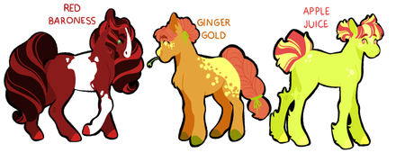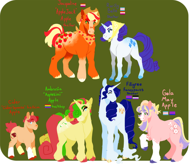 still a wip, cutie marks and filigree ajour will be added soon hehe! but here's the kiddos for nowApplejack is the middle Apple child, and the one who inherited Sweet Apple Acres when Granny Smith passed at the ripe old age of 200 years old. Running the apple farm had always been her dream, and she has a real knack for business. Unlike most of her friends and family, she never left Ponyville at all, and threw herself into work to distract herself from her loneliness. When her old friend Rarity left Canterlot and her husband, Fancy Pants, behind, Applejack opened her home to her wayward friend. This closeness rekindled an old spark between the two, and eventually they married. Since then, Sweet Apple Acres has grown into a huge business with merchandise and other apple goods under the direction of Applejack and Rarity