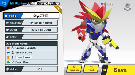 Mach Rider's first alternate color is the appearance she has as a trophy in Super Smash Bros Melee. The next color is the exact same as the default costume, but with a red helmet. This reflects Mach Rider's appearance in artwork and the artwork for the Famicom game's boxart. Next up is Mach Rider with darker blue replacing the light blue and red, which references Mach Rider's original sprite. Next is a fully green Mach Rider, which references a Quadrunner, an enemy in Mach Rider. Mach Rider then gets a purple alt, with the purple replacing the blue, and black replacing the red. This references an alternate color for Mach Rider. Mach Rider's final color swap is one that makes the blue and red on her suit a golden color. This references the colors of the text on the Mach Rider title screen. Finally, Mach Rider's final costume makes the red white, the blue skin-colored and will take Mach Rider's mask off, revealing her face. This also makes Mach Rider's voice lines hearable and not muffled.