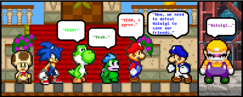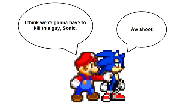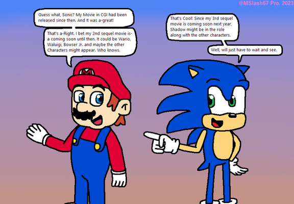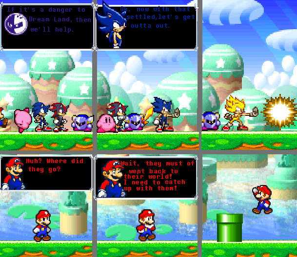 If you don't get the joke..........well...........................Nintendo put the iconic SMB over-world theme in some Mario games (Toad's house in NSMB games), Paper Mario (The first game where Mario have to collect 7 Star Spirits and Peach gets kidnap by Bowser.........why don't people bash this game, infact, all Paper Mario games have Peach gets kidnap at one point or another......they just a "Cool plot" or "Cool item" as a gimmick :/), Mario Party 9) and for Green Hill Zone............I need no explanation...it appears in Sonic 1, Sonic Mania (The Nostalgia Pandering (Well, it is normal so TAKE THAT SONIC MANIA FANS...........as much I am a fan, I think Sonic Mania should've been saved for when SEGA stop relying on Nostalgia) Cash-grab made by an group Classic Sonic fanbrats and SEGA help fund it), Sonic Generations, some spinoff titles, Sonic Forces, etc.) So Mario and Sonic had enough and I am pretty sure both fanbases also and are saying "NO MORE"...............