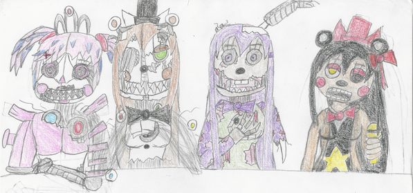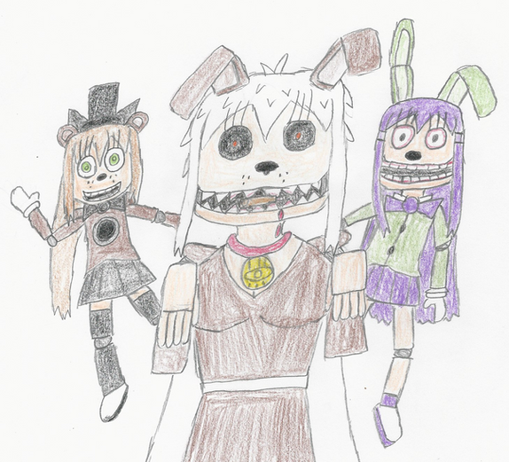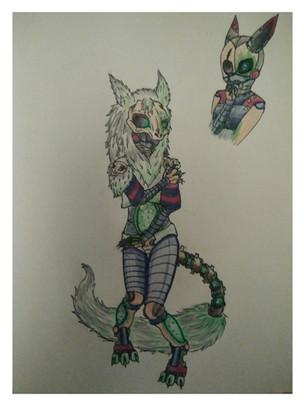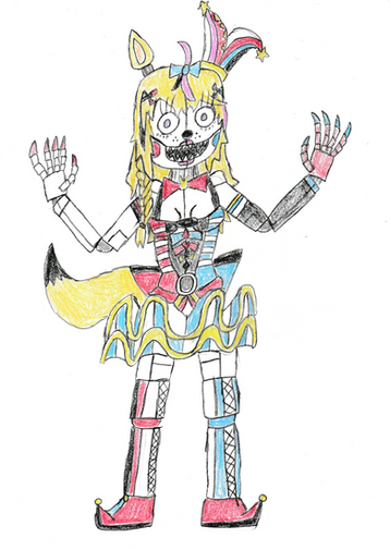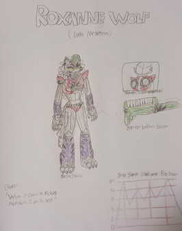 My own set of animatronics! These are the Gala animatronics. A gala is, by definition, a social gathering with special entertainments and/or performances. So a fancy word for party. I think this a perfect name for them since, well, it's their job to provide special entertainments and performances. Also, all the Gala animatronics are given full outfits. Just a design choice of mind to make them fully clothed. Their location is a new Freddy Fazbear's Pizza that's made as a rebranding of Fazbear Entertainment and the Fazbear franchise after the fire of Pizzeria Simulator.This is Gala Roxanne, a Gala version of Roxanne Wolf from FNaF Security Breach and that anthro wolf girl from the original Freddy in Space 2 teaser (the one with Buff Freddy and that Scott toke down because it was too over the top). I was originally going to make a Gala wolf more like Twisted Wolf, but I couldn't think of anything for him. Then I remembered that wolf girl existed. I think her design better fits these guys as they have more human like bodies like she does. Her full name is Roxanne Gwendolyn Fang, and sometimes goes by Roxy or Wendy. Her original name was Wendy before we knew Roxanne was the actual name of the wolf animatronic. I believe it was Dawko who named the wolf girl Wendy when he first saw the teaser. Back to Roxanne. She runs Gala Galaxy, another playground area for kids to run around and play on, but space themed. Like Gala Foxy and Vulpine, she also tells stories, but she also likes acting them out too. While Foxy would use props and acts out fight scenes, Wendy puts on full performances with the entire play area as her stage. She also appears in some of Gala Foxy's stories and vice versa. Not only is Gala Foxy a pirate, she's a space pirate. In her stories, Roxy is a bounty hunter who also likes hunting for treasure on the side, hence her run-ins with Foxy, making them rivals in each other's stories. In real life, they're best friends. Her design is mainly just that unnamed wolf girl as an animatronic, though I did change some things. You know, she kind of looks like a female Wolf O'Donnel from Star Fox. If she wasn't an animatronic, she could pass as Wolf's daughter.