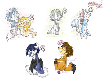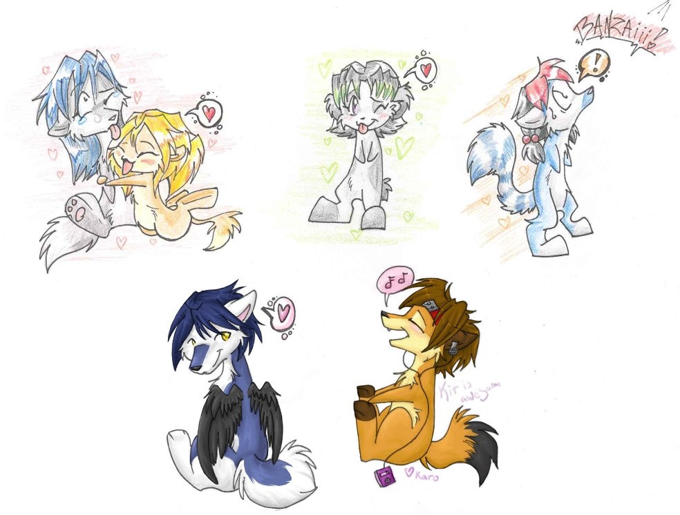I color with prismacolor and copic markers. Only recently have I purchased the copic markres and from what I've seen they're not terribly different. The way they handle is somewhat different but the end result is near the same for me. I don't have a preference, but if I had to choose one thing about them it's the copic... because they don't ROLL away XD so many markers have fell to the floor. I should also point out that I'm really impressed with how copic blacks look, you can see from Tairu's (the panda) arm lower right and Chums (the shark) top right that the blacks are noticeably deeper in Chum's hair.