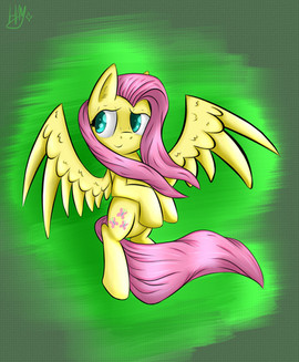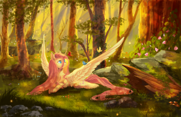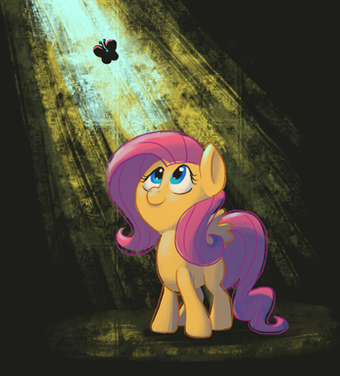 I love the somewhat sketchy feel of the outlines left in. On Flutters it's pretty clean, but in the foreground it somehow makes the bushes and branches look more... I dunno, "alive" somehow. As for Flutters, the stylization is just adorable. Sweet work with the light, too. And the different brush type helps her stand out nicely from the background. Thank you!