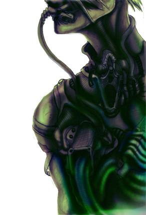 Kade, previously known as KD-58b, is a stealth droid widowed from the Government force due to the great exodus. Due to his programming, he is a natural plunderer and will spend entire weeks watching the same entities in order to plan a raid for a single vile of fuel. He is also quite stubborn and will go to extremes to obtain food and worthless objects he deems "interesting". Despite this, he is extremely loyal (mostly to things) and will do anything in his power to protect things that are important to him. However, it is hard to gain his trust because of his previous "spy" occupation. Because of this, he is often alone and will isolate himself in hidden areas feeding off of tanks of fuel he's collected for months at a time. Once you do gain his loyalty, however, he will serve you at his own expense.His demeanor is usually rather calm, but he is quite high-strung and extremely paranoid and cautious of everything around him and wears spikes to keep anyone from getting too close. He is also quite sly, opportunistic, and an excellent problem solver. Because of his thievery, most other surviving bots find his kind extremely annoying and looked down upon as desperate low-lifes who only care about hording fuel and running amok. However, very few have actually seen them, and are regarded by some as myths or excuses made by the ill minded.