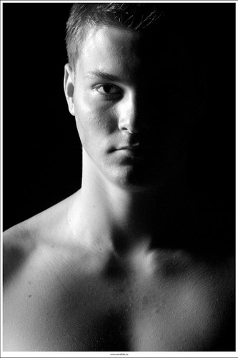 the harsh light creates some nice shadows especially around the collar bones. i like the blue/purple lighting. gives a cold feel to the image that's belied by his soft calm expression. nice stubble too. and i don't like facial hair, so that's saying something.