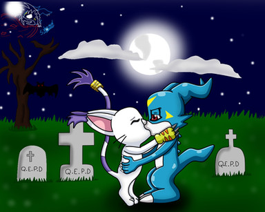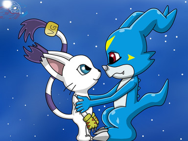 Alex (V-mon) is a small blue and white dragon, he has battle scars in some areas of his body, his eyes are dark blue and a yellow "V" on his forehead, characteristic of his species .