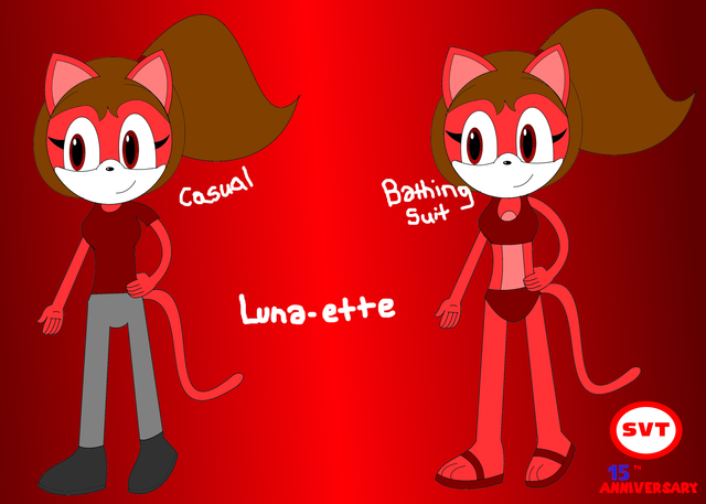 This is an art trade withI drew her persona in the style of Sonic the Hedgehog and thought of a rabbit. I drew her casual clothes as well as what her bathing suit would look like.