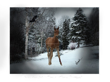 details- merry christmas ~FlameTheFireStallion ! this is her boy, Flame. he was a lot of fun to do, i was going to put him in a fall-themed forest, but then remembered it's christmas! i can't decide if he's spooking at something (he's a spooky little thang) or if he's pissed off at the snow, when i figure it out, i'll let you know xD i hope i got him right