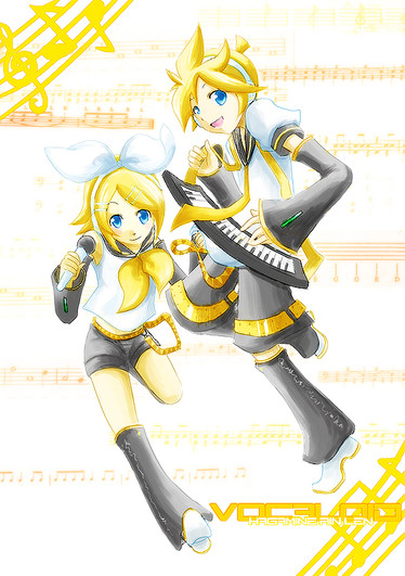 I know who they are now and listened to their music! they're Rin and Len and they're voice synthesizers and awesome!